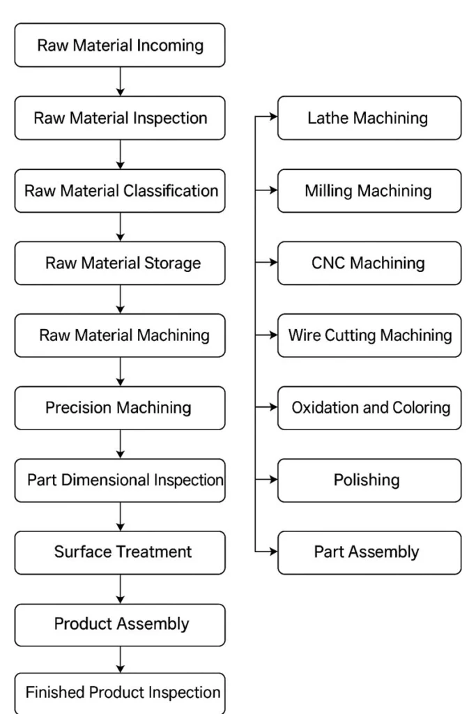 The high precision cnc parts requires a well-structured and tightly controlled process. From raw material incoming inspection and CNC machining to surface treatment, assembly, and final inspection, every step plays a critical role in ensuring product quality and performance.